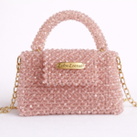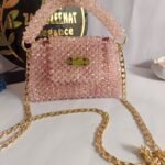 This beautiful bag showcases a stunning glass crystal design, adding a touch of elegance and sophistication. Inside, it is lined with smooth, luxurious silk for a soft and refined feel. The magnet button closure ensures easy access while keeping your belongings secure. The metallic chain adds durability and style, and the beaded handle adds a unique, intricate touch, making it the perfect accessory for any special occasion.